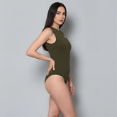 El Body Asimétrico Detalle Cruzado verde militar está elaborado con 95% Nylon / 5% Elastano de primera calidad, elaborada con doble capa para evitar transparencias y costuras invisibles.