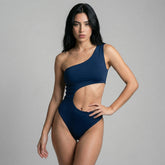 El Body Asimétrico Lateral Azul Marino está elaborado con 95% Nylon / 5% Elastano de primera calidad, elaborada con doble capa para evitar transparencias y costuras invisibles.