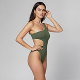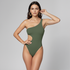 El Body Asimétrico Lateral verde militar está elaborado con 95% Nylon / 5% Elastano de primera calidad, elaborada con doble capa para evitar transparencias y costuras invisibles.