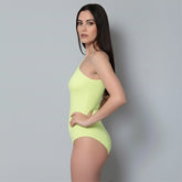 El Body asimétrico sin mangas Amarillo Mantequilla está elaborado con 95% Nylon / 5% Elastano de primera calidad, elaborada con doble capa para evitar transparencias y costuras invisibles.