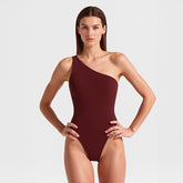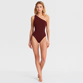 El Body asimétrico sin mangas Borgoña está elaborado con 95% Nylon / 5% Elastano de primera calidad, elaborada con doble capa para evitar transparencias y costuras invisibles.