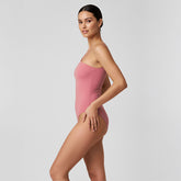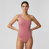 El Body asimétrico sin mangas Rosa Ambar está elaborado con 95% Nylon / 5% Elastano de primera calidad, elaborada con doble capa para evitar transparencias y costuras invisibles.