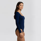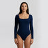 El Body cuadrado manga larga azul marino está elaborado con 95% Nylon / 5% Elastano de primera calidad, elaborada con doble capa para evitar transparencias y costuras invisibles.