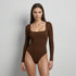 El Body Cuadrado Manga Larga Café está elaborado con 95% Nylon / 5% Elastano de primera calidad, elaborada con doble capa para evitar transparencias y costuras invisibles.
