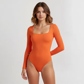 El Body Cuadrado Manga Larga Naranja está elaborado con 95% Nylon / 5% Elastano de primera calidad, elaborada con doble capa para evitar transparencias y costuras invisibles.