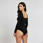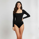 El Body cuadrado manga larga Negro está elaborado con 95% Nylon / 5% Elastano de primera calidad, elaborada con doble capa para evitar transparencias y costuras invisibles.