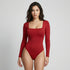 El Body Cuadrado Manga Larga Rojo está elaborado con 95% Nylon / 5% Elastano de primera calidad, elaborada con doble capa para evitar transparencias y costuras invisibles.