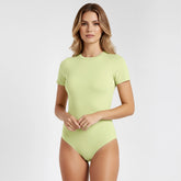 El Body cuello redondo manga corta Amarillo Mantequilla está elaborado con 95% Nylon / 5% Elastano de primera calidad, elaborada con doble capa para evitar transparencias y costuras invisibles.