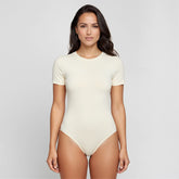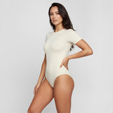 El Body cuello redondo manga corta marfil está elaborado con 95% Nylon / 5% Elastano de primera calidad, elaborada con doble capa para evitar transparencias y costuras invisibles.