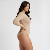 El Body Redondo Manga Larga Beige Talla Grande está elaborado con 95% Nylon / 5% Elastano de primera calidad, elaborada con doble capa para evitar transparencias y costuras invisibles.
