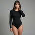El Body Redondo Manga Larga Negro está elaborado con 95% Nylon / 5% Elastano de primera calidad, elaborada con doble capa para evitar transparencias y costuras invisibles.