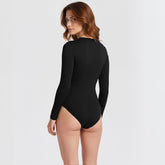El Body Redondo Manga Larga negro cuenta con un práctico cierre de gancho de dos posiciones en la parte inferior, lo que facilita ponerlo y quitarlo.