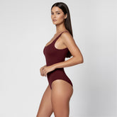 El Body Tirantes Escote Cuadrado Borgoña está elaborado con 95% Nylon / 5% Elastano de primera calidad, elaborada con doble capa para evitar transparencias y costuras invisibles.