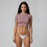 El Crop Top Cuello Redondo Manga Corta Beige Tostado está elaborado con 95% Nylon / 5% Elastano de primera calidad, elaborada con doble capa para evitar transparencias y costuras invisibles.