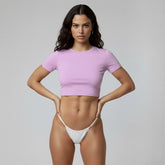 El Crop Top Cuello Redondo Manga Corta Lila está elaborado con 95% Nylon / 5% Elastano de primera calidad, elaborada con doble capa para evitar transparencias y costuras invisibles.