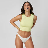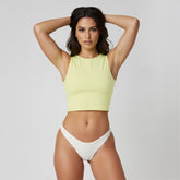 El Crop Top Halter Amarillo Mantequilla está elaborado con 95% Nylon / 5% Elastano de primera calidad, elaborada con doble capa para evitar transparencias y costuras invisibles.